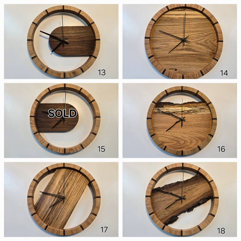 Our clocks are made with Oak and Black Walnut rounds and variety of inner wood pieces. email us about pricing and availability